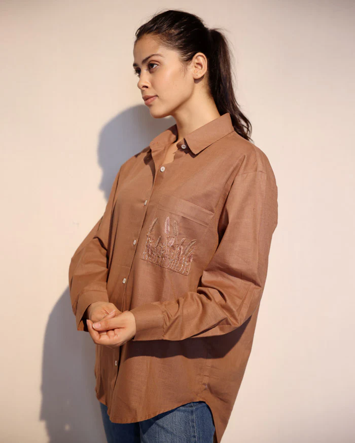 This is a handloom cotton linen shirt with hand embroidered patch pocket.