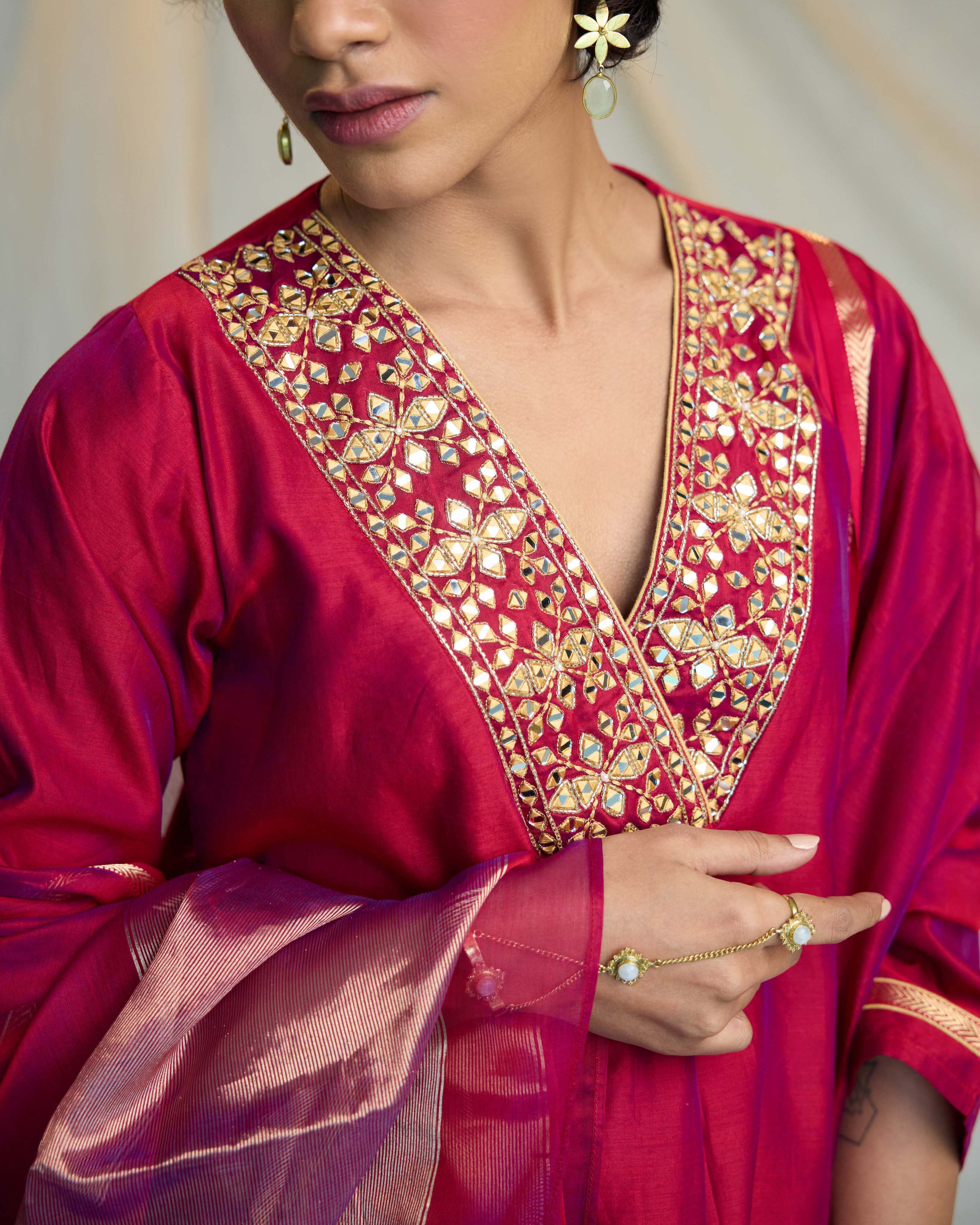 - Intricate mirror embroidery on the neckline
