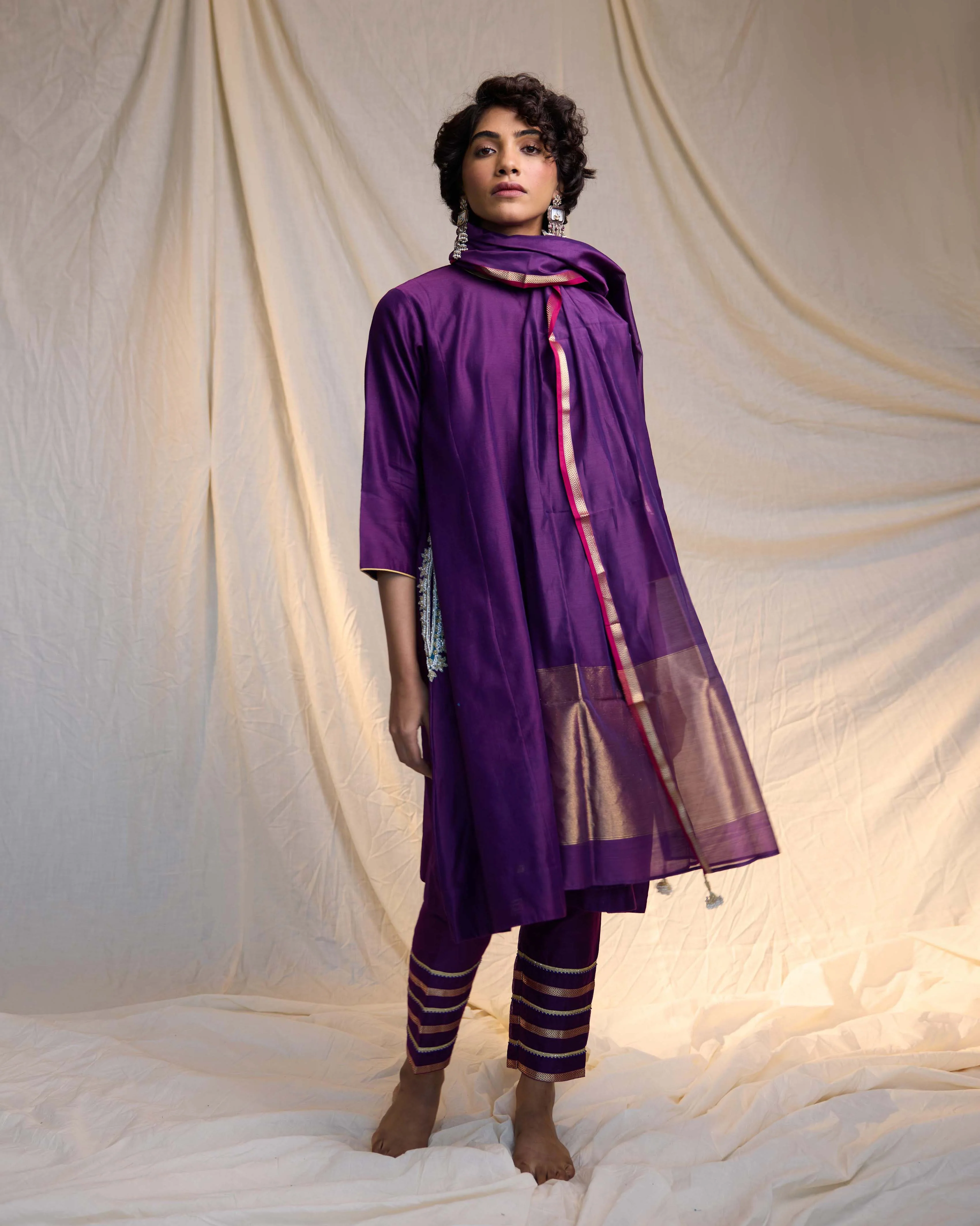 This knee-length A-line kurta is thoughtfully designed with side panels for a graceful flare. Featuring 3/4th sleeves and two functional pockets adorned with delicate hand embroidery, it combines style and practicality effortlessly. Paired with pencil-fit pants with subtle detailing, this set creates a polished, contemporary look perfect for festive occasions.